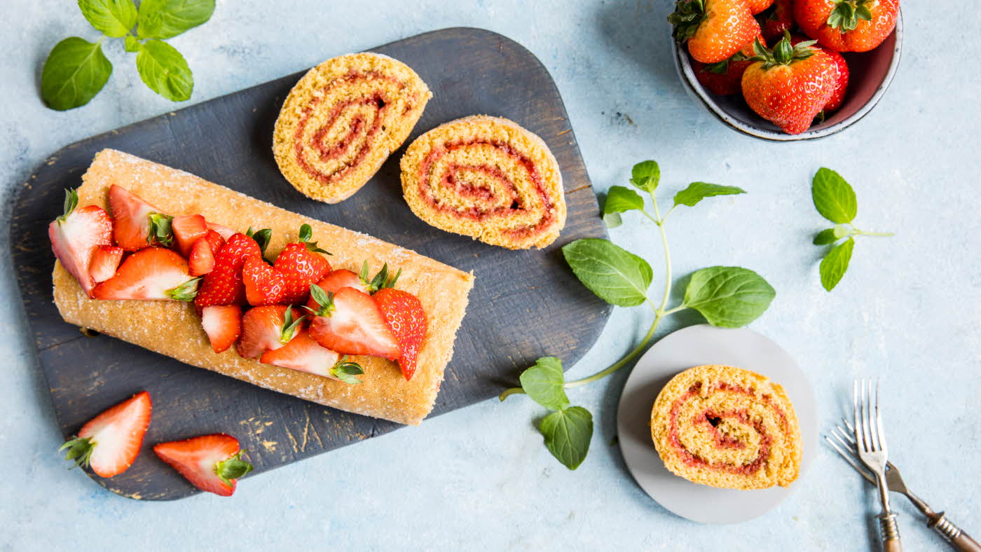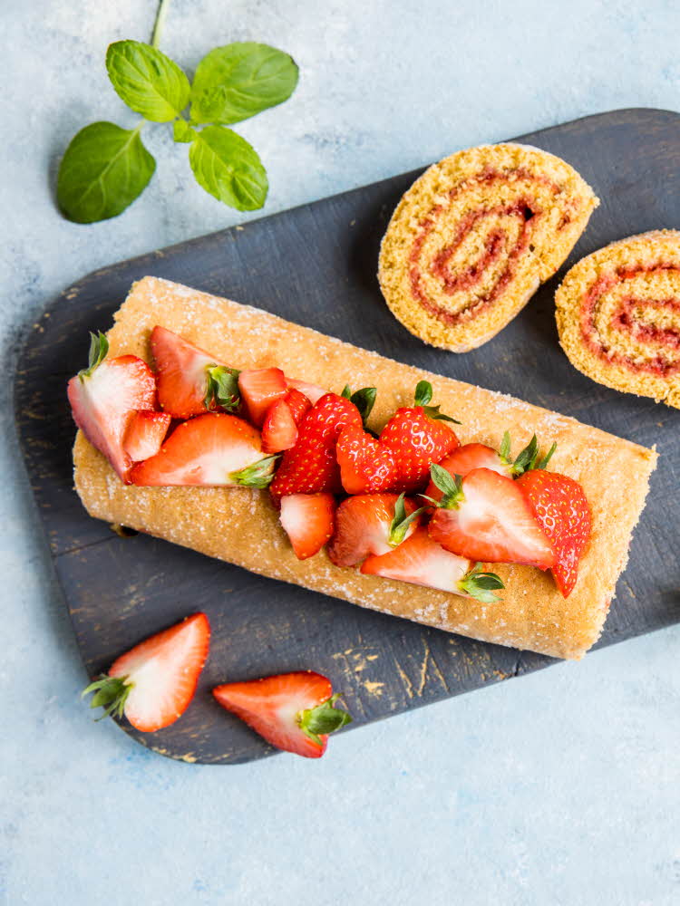 Avsluta middagen med en god rulltårta som du serverar med färska bär och lite mynta.