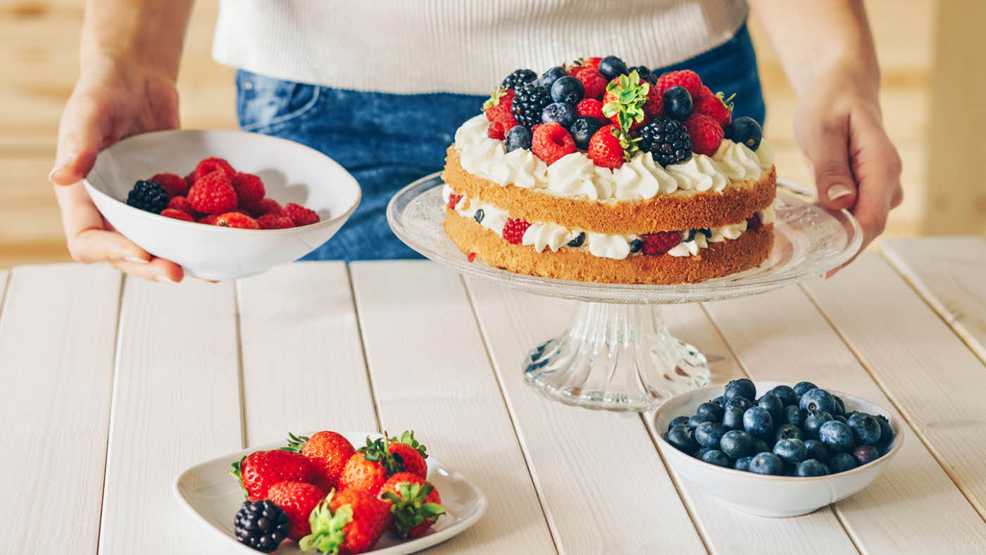 En konformad glasstrut kan fungera som servetthållare, en pavlova täckt med färgglada bär och frukter är ett konstverk i sig själv medan en stor glasbehållare för dryck fylld med färgglad lemonad är både snygg att se på och smart att ha om det är varmt.