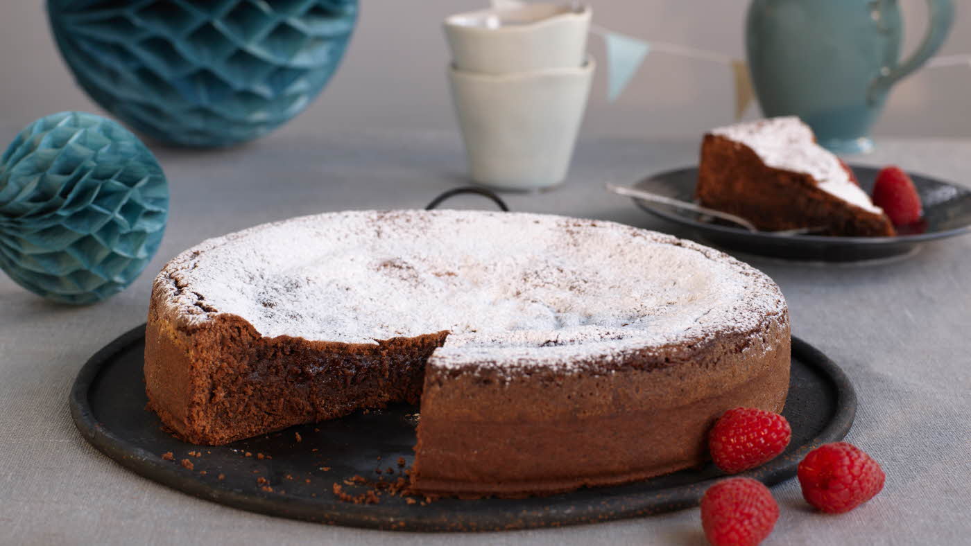 - Häll smeten i en smord och mjölad form, 22 cm i diameter. Sätt in formen på nedersta gallret i ugnen och grädda i ca 20 minuter. Kakan ska vara mjuk i mitten.