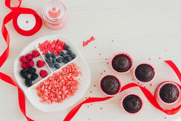 Fira kärlekens dag med att servera söta kakor till din älskade. Välj mellan läckra chokladmuffins eller en härlig chokladkaka.
