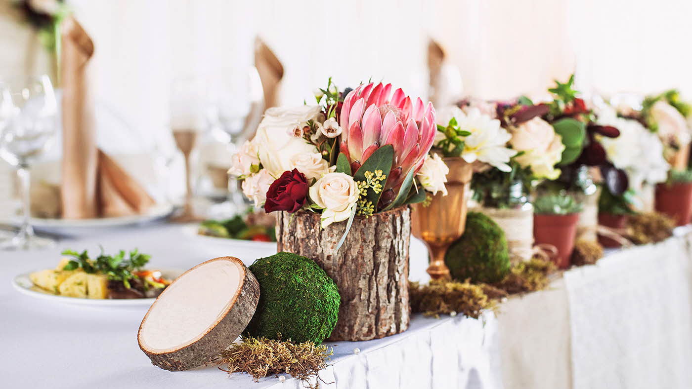 Så ta in naturen i bröllopslokalen och ersätt lite av det ruggade uttrycket med otämjda och frodiga växter.