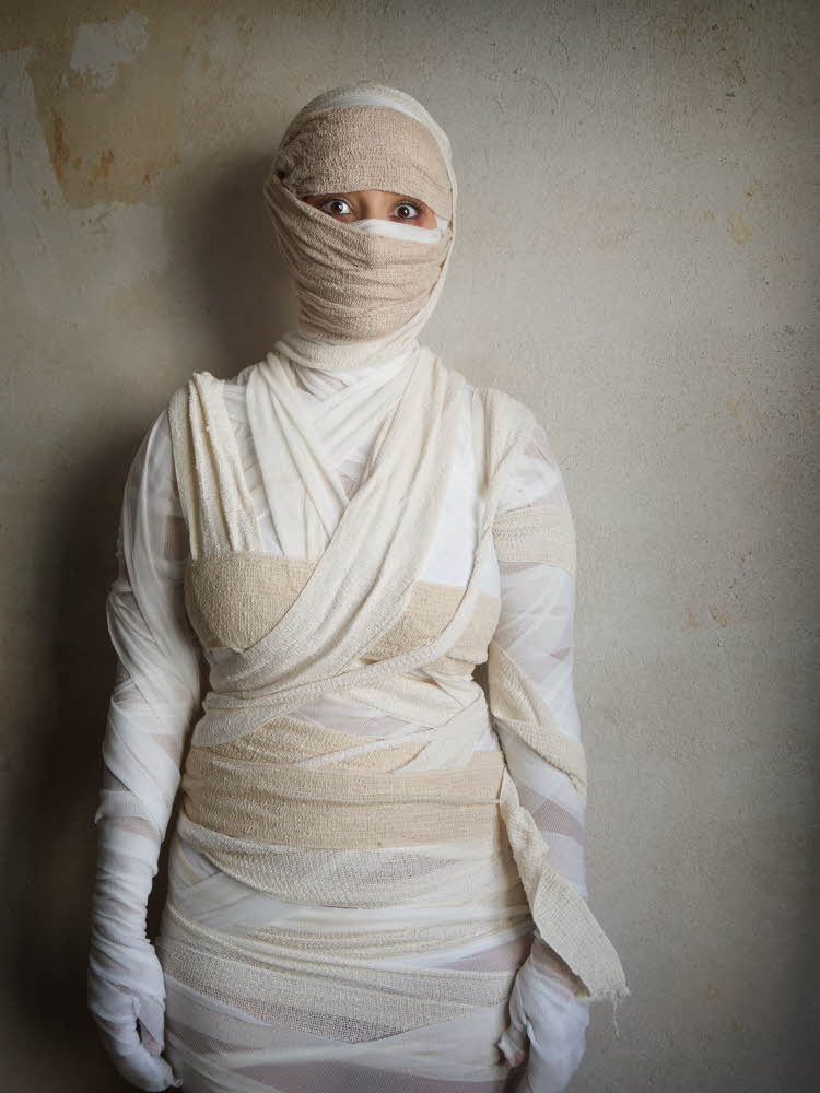 En mumiedräkt kanske ser avancerad ut, men vi kan garantera att du gör den på ett litet kick. Och det bästa av allt är att det kräver väldigt få saker. Du behöver bara en vit t-shirt eller tröja, vita strumpbyxor eller byxor, bandage och lite idrottstejp.
