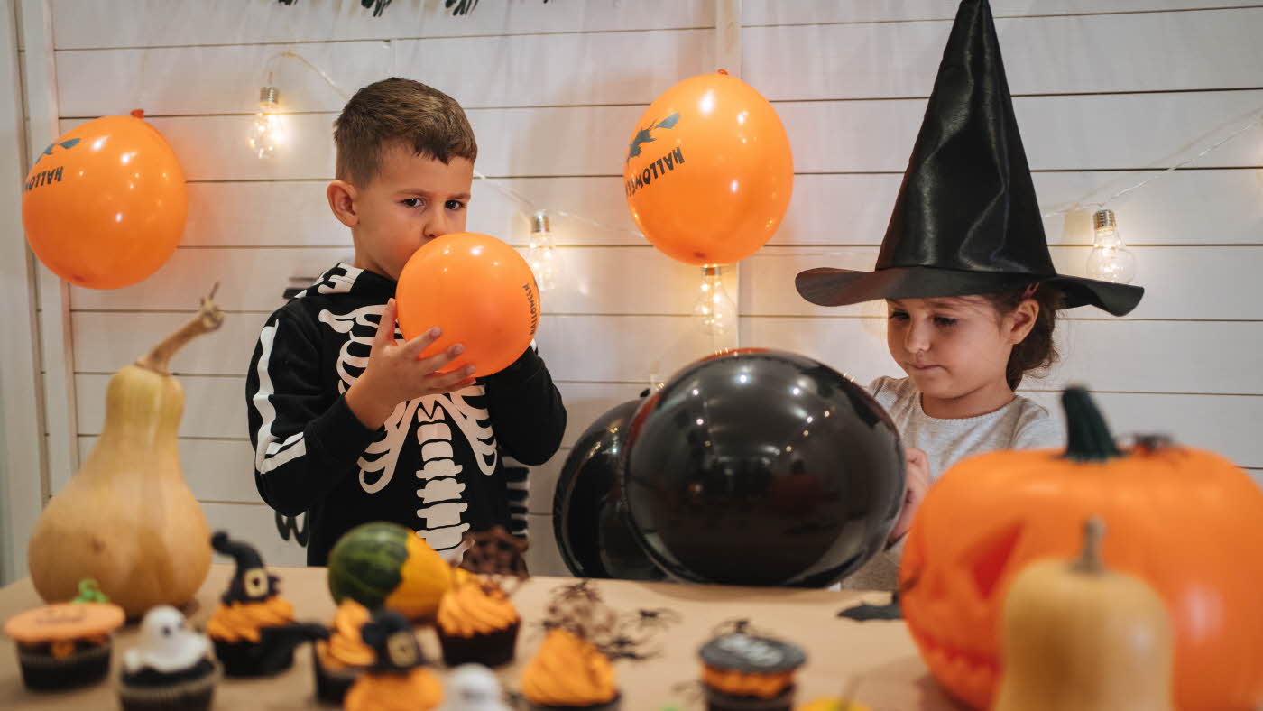 Köp ballonger med halloweentema och låt dem vara en del av pyntet tills ni ska leka.