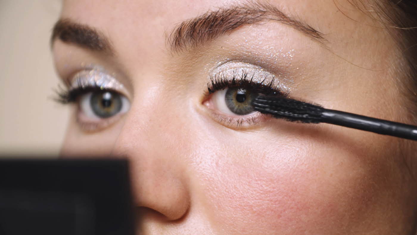 Applicera sedan mascara. För en glitter-look är det bra med ganska mycket mascara, eftersom det ramar in ögonen och ser till att de verkligen hamnar i fokus.