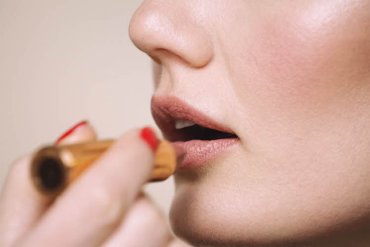 Applicera sedan läppstift. Eftersom ögonen ska vara i fokus har den här looken använt ett nude-färgat läppstift. Tricket är att först lägga ett lager, kyssa av på en servett och sedan lägga till ett lager. Då har du läppstift som sitter hela kvällen!