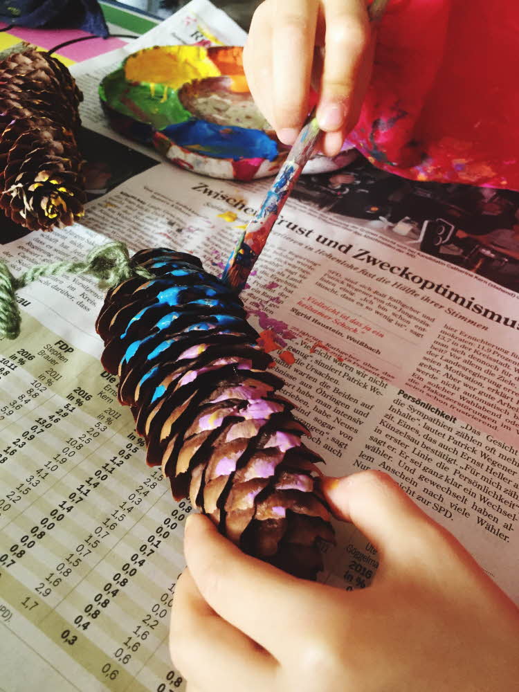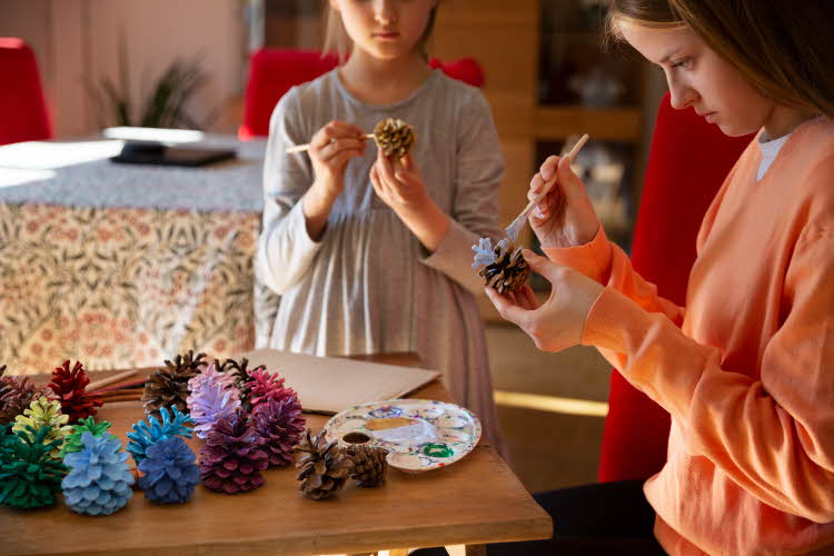 Måla kottarna i de färger du vill ha, antingen hela eller delar av dem. Här är det åldern som avgör hur avancerad du vill vara.