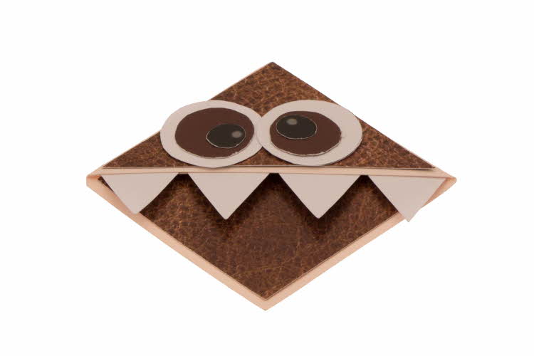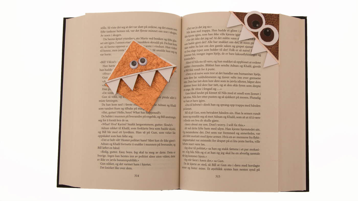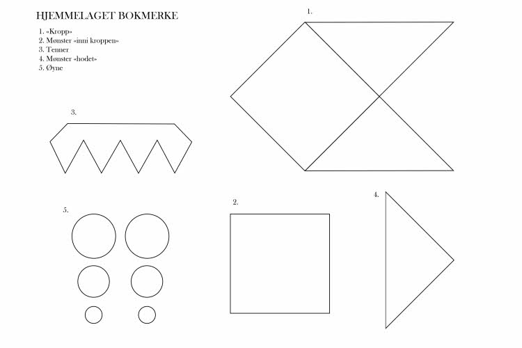 - Ta fram trekanten (nr. 4) och limma denna på utsidan av bokmärket. Detta blir monstrets huvud.
