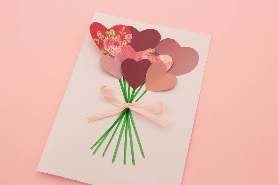Tips: Vik hjärtan försiktigt på mitten och limma endast på mitten eller på ena sidan. På så sätt kommer ”blommorna” fram bättre och kortet får ett mer livligt utseende. Det får helt enkelt en liten 3D-effekt.