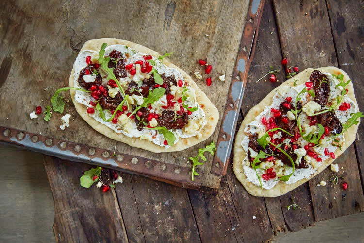 Lägg ut bröden på en bakplåtspappersklädd plåt, bred på färskostblandningen, toppa med stekt lammskav och blomkål i små buketter. Sätt in pizzorna i ugnen på 200°C i 4-6 minuter. Toppa pizzorna med granatäpple och rucola precis före servering. Strö gärna över lite färsk timjan och grovmalen peppar till garnering.