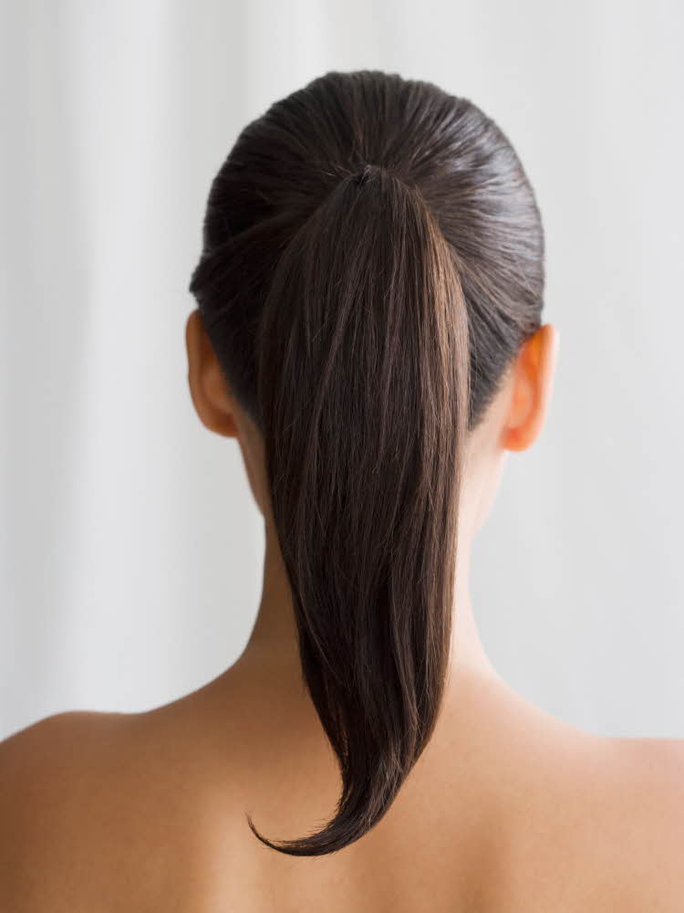 En förutsättning för glamorösa hästsvansar – oavsett om de är höga eller låga – är att babyhåren inte förstör det strama uttrycket. Applicera därför lite hårgelé eller hårspray på toppen av håret innan du borstar det hårt tillbaka.