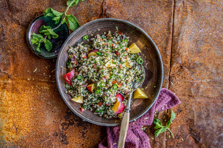Bulgur är ett vetekorn som används mycket i Mellanöstern, med en mild nötig smak som gör att den passar till mycket. Prova denna fräscha tabboulehsallad med nektariner, korinter och grön chili.