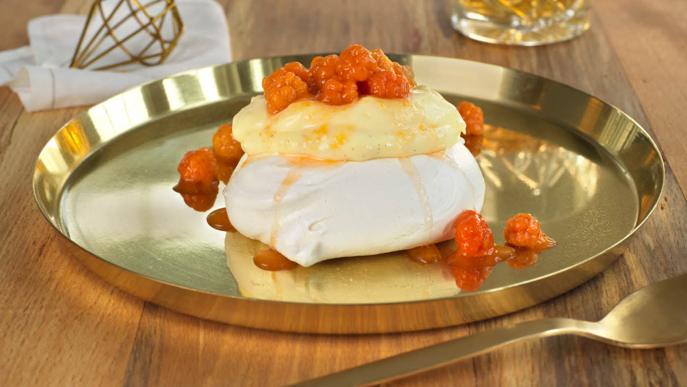 Minipavlova med krispig botten och sammetslen äggkräm. Toppat med hjortron.