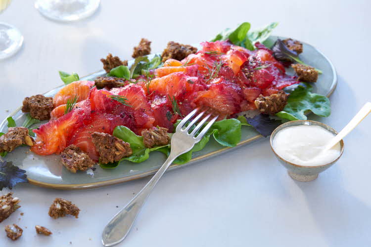 - När forellfilén är färdiggravad, skrapa av rödbeta och torka försiktigt med papper. Skär i tunna skivor och lägg upp på huvudsalladsblad.
