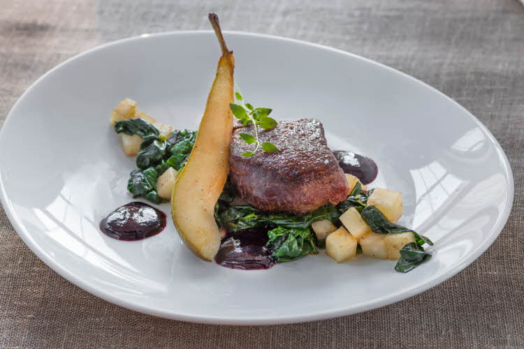 Saftig renfilé med en fyllig och smakrik blåbärssås. Servera med smörstekt päron, spenat och tärningar av rotselleri.
