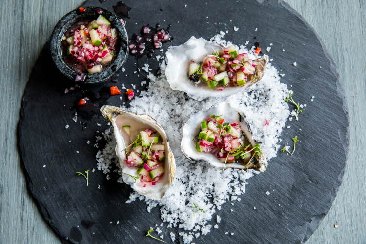 Färska ostron är en exklusiv delikatess. Toppa de öppna skalen med en fräsch blandning av rödlök, gurka, lime och krasse eller servera dem naturella med några droppar citron.