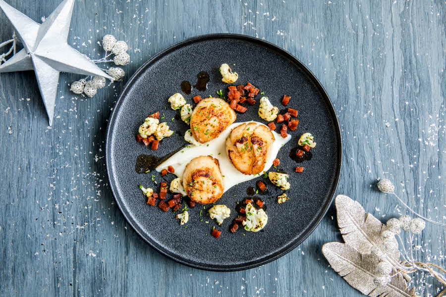 - Lägg en klick blomkålspuré på varje tallrik och lägg över kammusslorna.