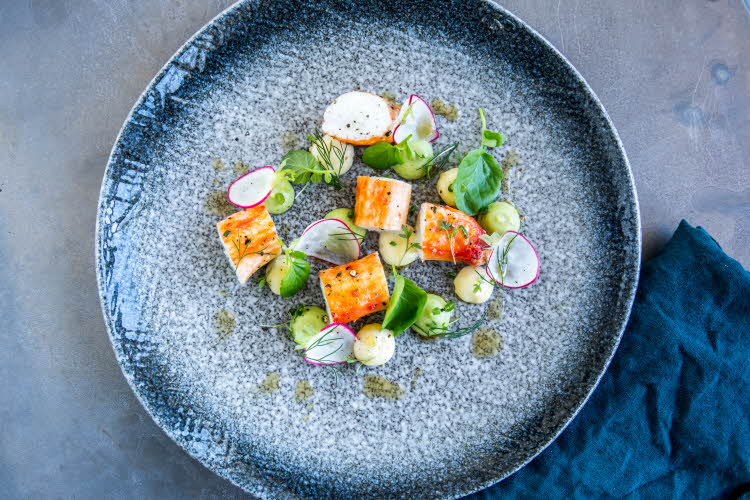 - Lägg upp tallriken genom att först lägga på avokadokräm och aioli. Lägg sedan på bitar av kungskrabba och resten av örterna.