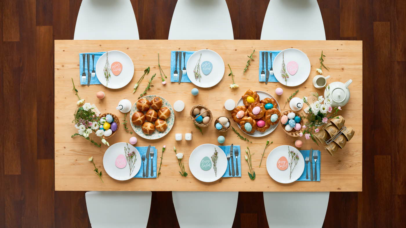 En härlig påsk innehåller mycket god mat och långa samtal. Matbordet spelar därför en central roll i påskdekorationerna. Vi föreslår att du gör fina äggformade placeringskort och knyter servetterna i form av kaninöron.