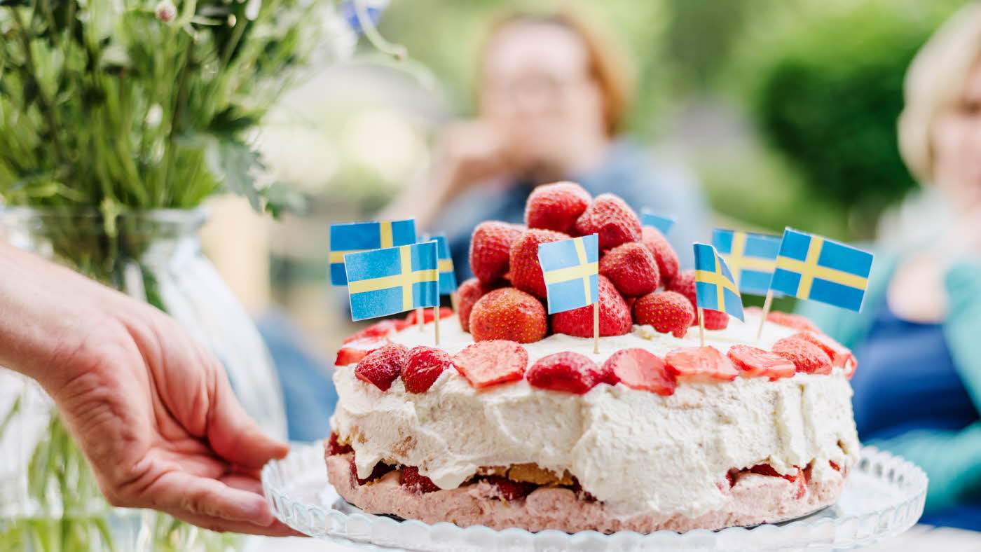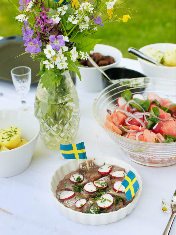 Vad gäller mat så är sill i fokus. Servera sill med potatis, gräslök och gräddfil. Men förät dig inte på sillbordet – till efterrätt serveras nämligen massor av jordgubbar och gräddtårta.