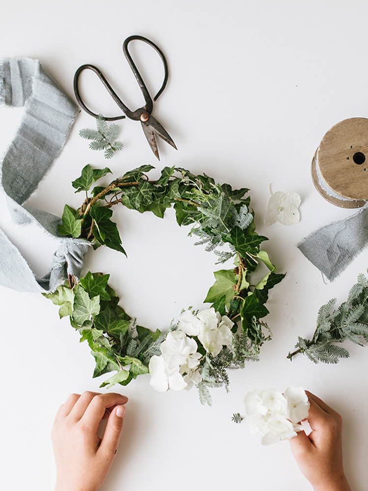 - Skapa en stomme av bindtråd, måtta runt huvudet och ta till lite extra längd så att kransen inte blir för liten när blommorna väl sitter på plats.