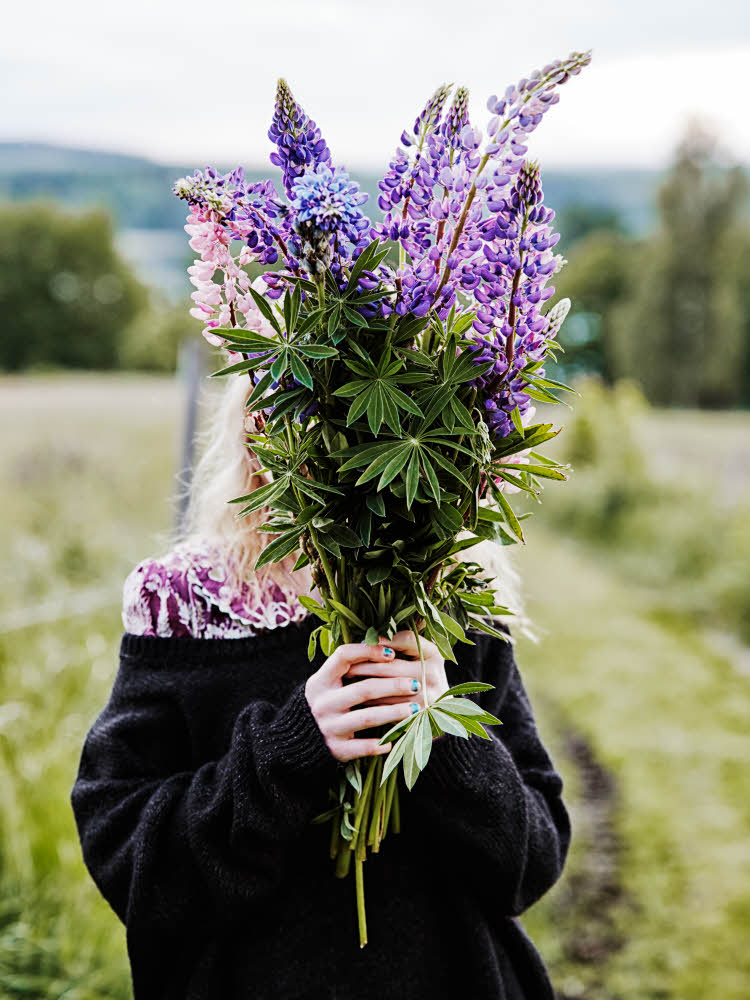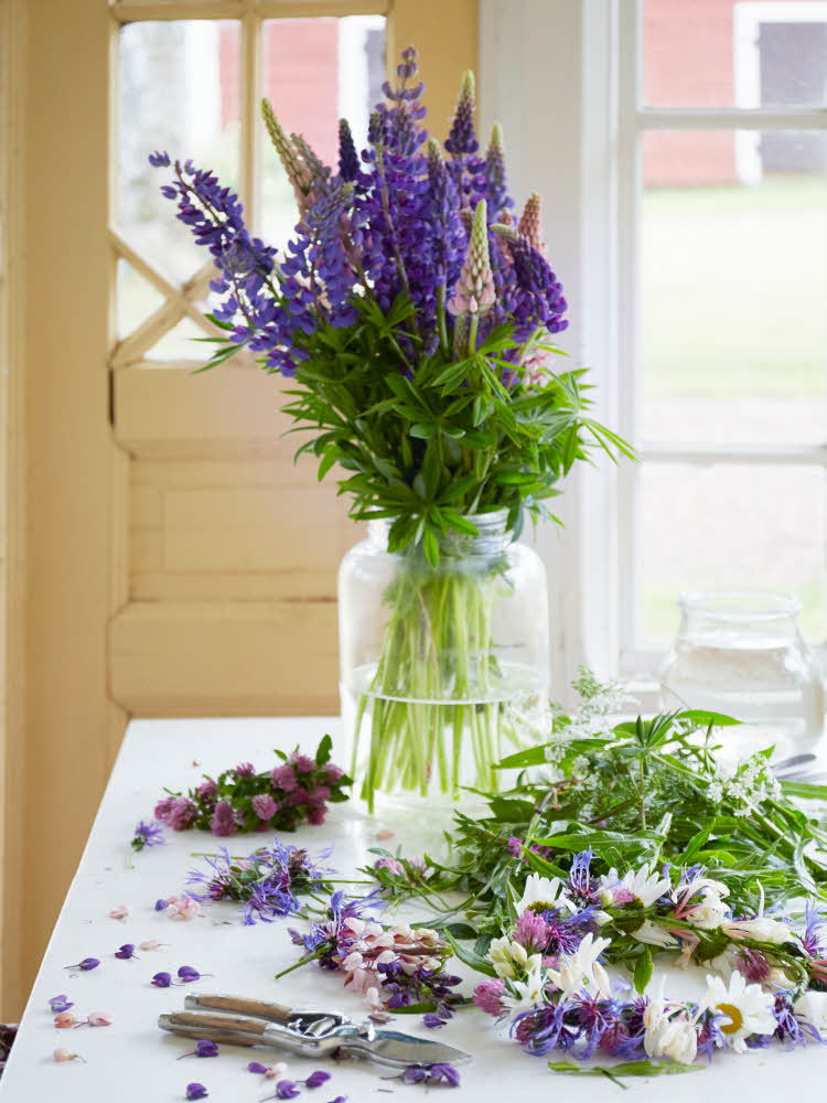Plocka ängsblommor eller använd snittblommor som pioner, margueriter eller liljor, gröna växter eller grenar och strån. Om du bor i närheten av en åker är det lättast att springa ut och plocka med dig några buntar lupin. Det är som vackrast när det är lite vilt och somrigt! Har du lite till över kan du dessutom göra en blomkrans till dig själv eller dina gäster.