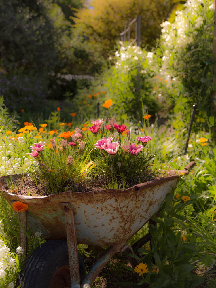 Låt gärna trädgårdsspaden stå i jorden i blomsterbädden för en extra rustik och enhetlig stämning.