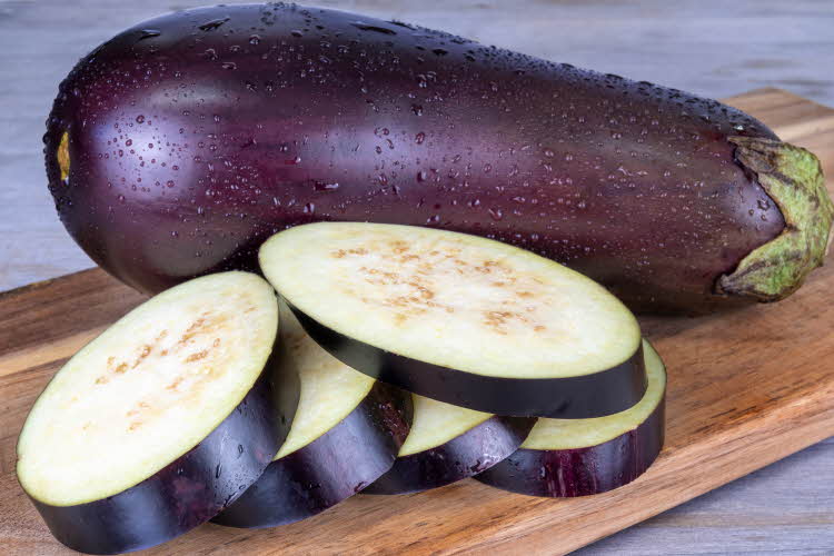 - Dela auberginen på längden och skär den i cirka ½ cm tunna skivor.