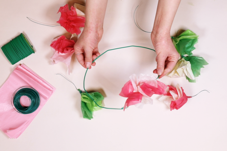 Vill du ha en krans som aldrig vissnar? Skapa små blommor och blad av silkespapper och fäst med lim på en stomme av papper eller tejpad ståltråd. Du kan också välja bort stommen och istället trä en tunn tråd genom pappret med hjälp av en nål. Kransen blir slappare men ligger fint på allas huvud eftersom den är rörlig.