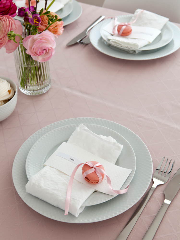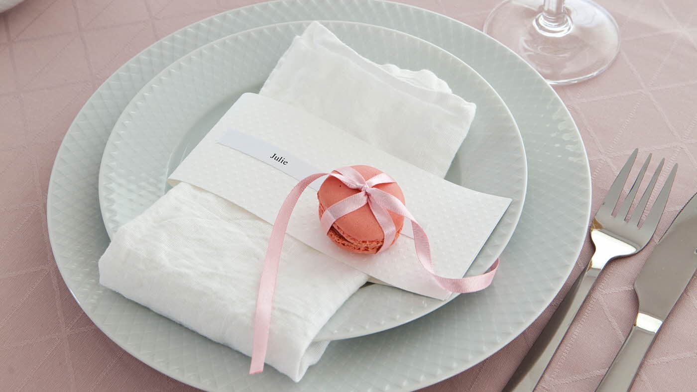 Pynta med en söt hälsning – här har vi använt en macaron med rosett runt. Samla vackra blommor och spirande kvistar i flera vaser på bordet.