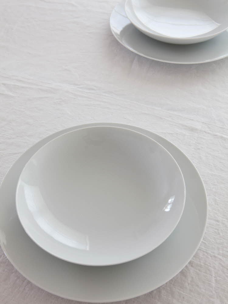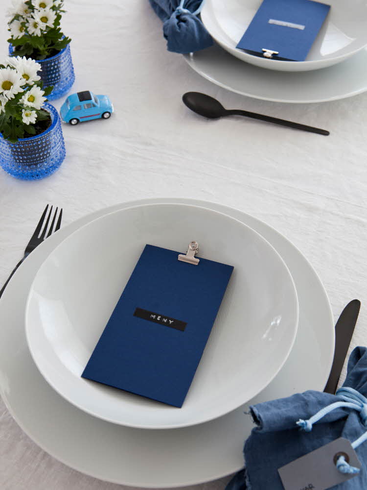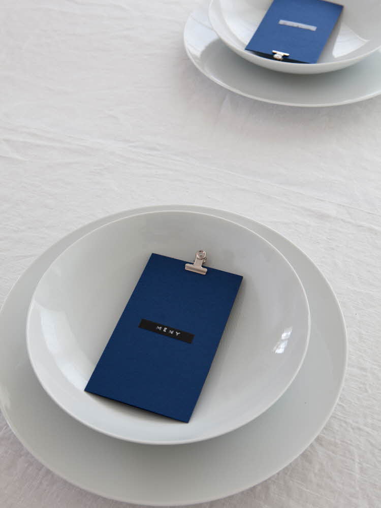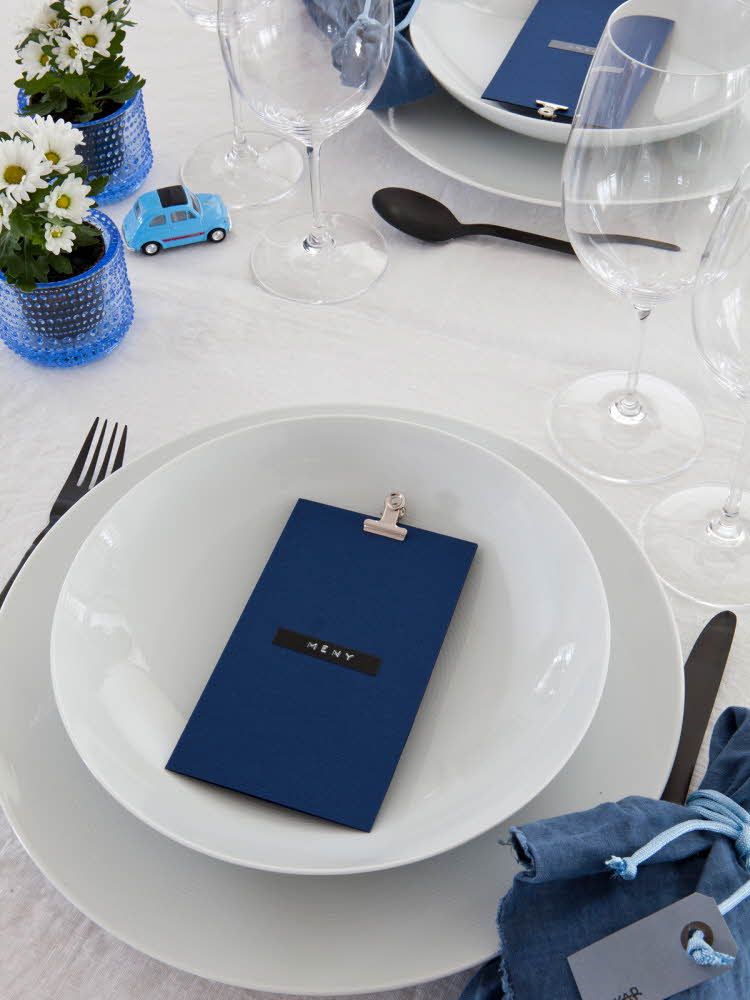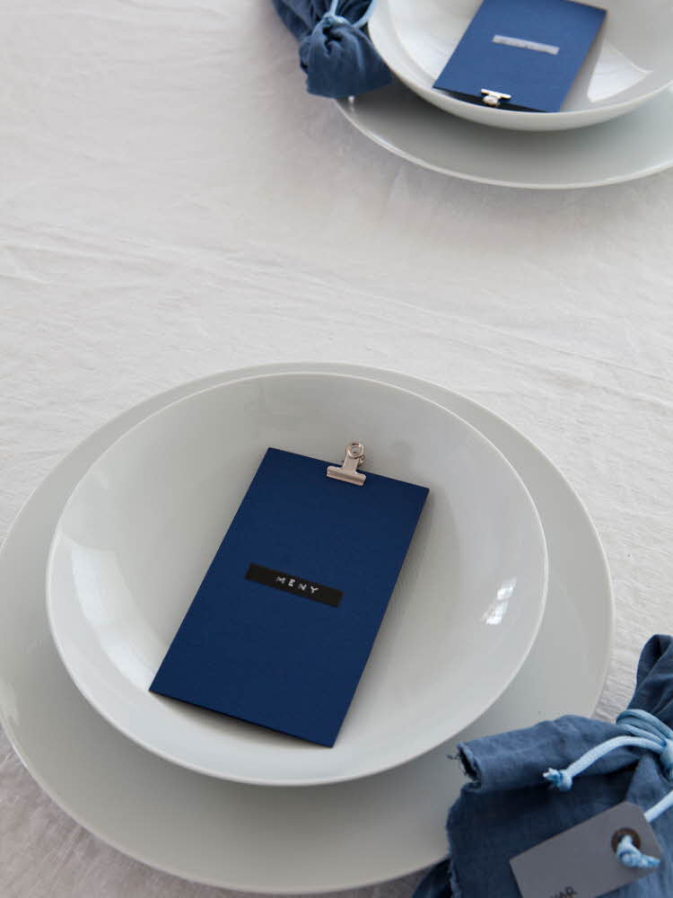 När bordet är neutralt vitt är det vackert att hålla färgerna på detaljerna i samma ton. För ett vackert sammanvävt uttryck. Här är det blått som går igen.