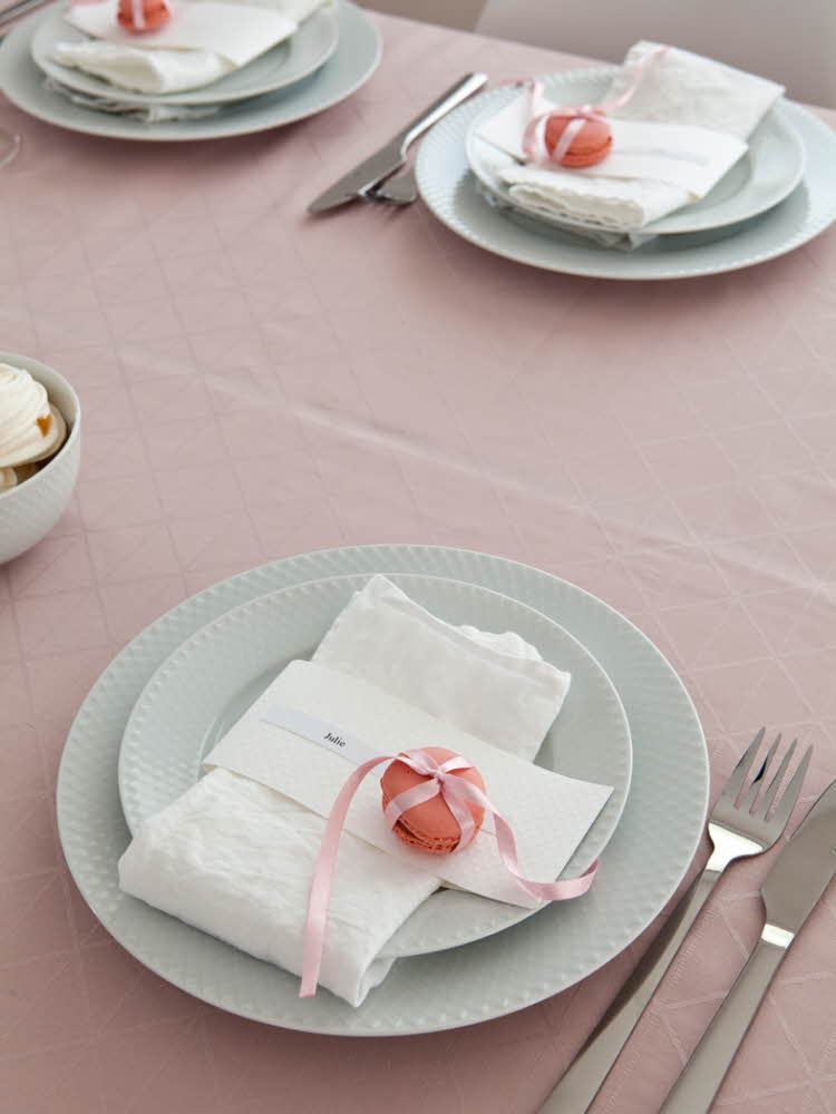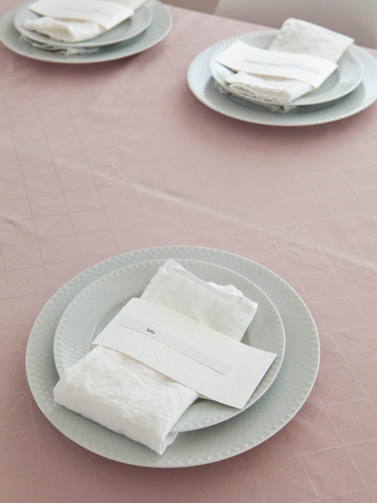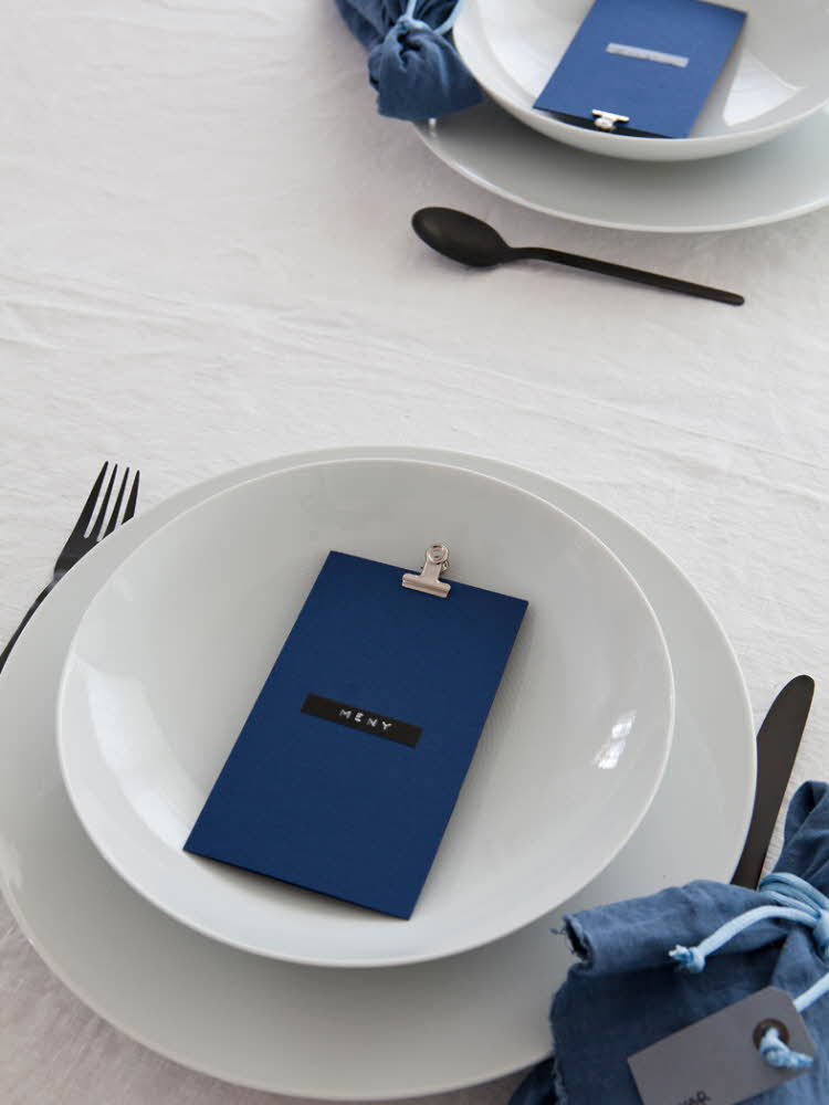 Linneservetterna viker och knyter du ihop med en ljusblå nylontråd, det bryter av det grafiska uttrycket på ett snyggt sätt. Placeringskort består av en grå namnlapp som är fäst vid nylontråden.